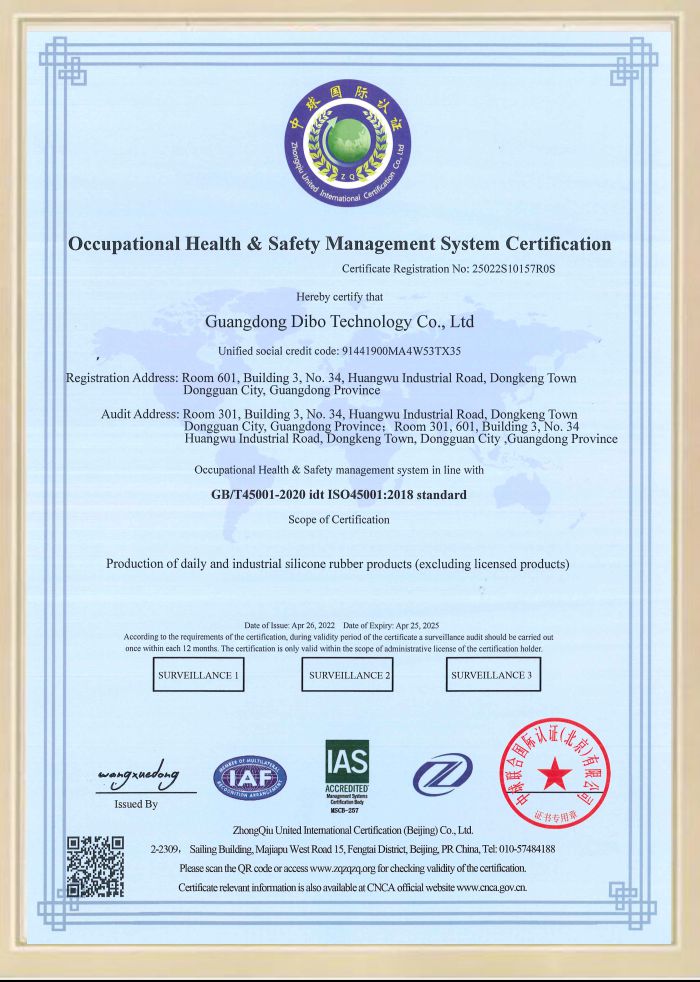廣東帝博科技有限公位于2019年起施行每年檢測認(rèn)證報告,由于硅膠制品行業(yè)屬于環(huán)保安全行業(yè),客戶的需求以及反饋都決定我們的實力,目前我司已認(rèn)證ISO9001、ISO14001、ISO45001、迪士尼認(rèn)證、FDA、ROHS、LFGB、CPC等一系列檢測認(rèn)證