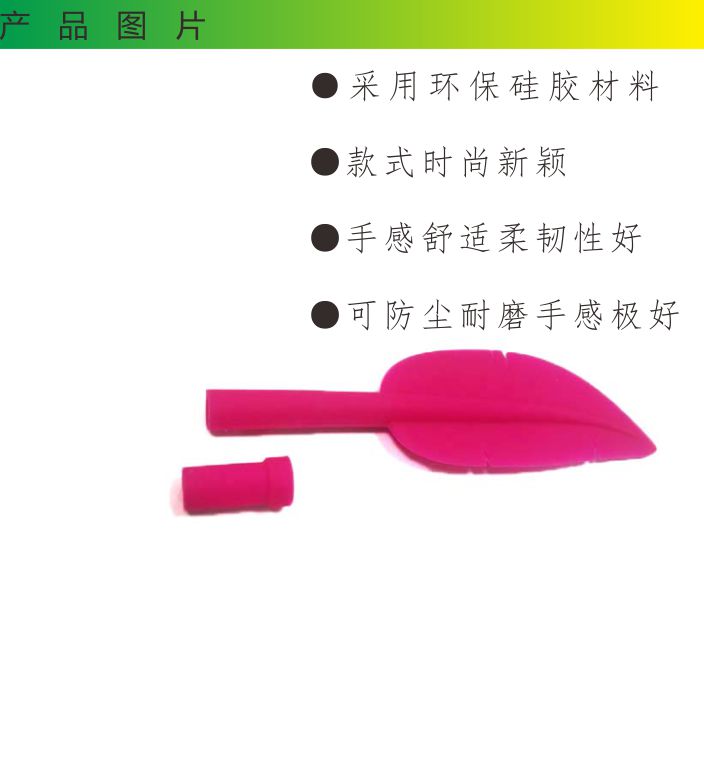 13712483599羽毛形狀硅膠筆套,是硅膠制品中的一種,由東莞帝博硅膠制品廠家創意研發,在筆套內套上直徑為6cm左右大的筆芯即可使用,材料選用環保硅膠高溫成型,無毒無味,產品柔軟有彈性,而且非常的有手感,書寫更華麗。適合很多場合使用,搭配鮮艷的顏色更是讓這款產品如虎添翼,找不出一點瑕疵。